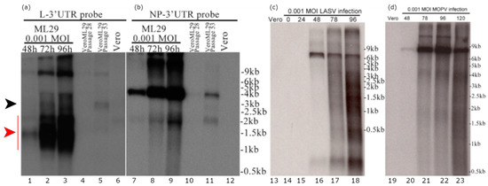 Detection of defective viral genomes (DVGs) containing large deletions is one of the major features of viral preps containing DIPs [20]. DIP-associated DVGs originate from wild-type viral genomes and act by competition with viral genomes for replication or packaging, or both. Earlier studies documented that DIPs produced by LASV-persistently infected Vero cells were more resistant to UV-light and lacked large RNA species as reveled by high velocity centrifugation in sucrose density gradients compared to RNA isolated from acutely LASV infected cells [55]. Recently, we have established Vero cells persistently infected with ML29 [13]. These cells generated interfering particles that strongly interfered with the replication of homologous and closely-related infectious viruses (LASV, MOPV, LCMV) [13]. However, we failed to detect DVGs in ML29-persistently infected cells using an RT-PCR approach targeting either L or S RNA of ML29. In this study, using Northern blotting analysis, we identified, in addition to the high molecular mass L genome and anti-genome/L mRNAs, several L-derived sub-genomic RNA species (Figure 1). These sub-genomic RNA species were not related to the Z mRNA. Among these sub-genomic RNAs, the predominant species gradually accumulated during 2–4 DPI were RNA species that migrated as a heterogeneous band in the area of ~1.5 kb (Figure 1a, lanes 1–3, red arrow). Notably, these sub-genomic species were detected with the L RNA probe in cells infected with ML29 at low MOI but were not detectable in LASV- and MOPV-infected cells (MOI = 0.001). In LASV- and MOPV-infected cells, as expected, the L RNA probe detected a predominant band that migrated at a rate concordant with the appropriate molecular mass (~7 kb) for L genome, anti-genome, and likely mRNA, unresolved under current experimental condition (Figure 1c,d).
