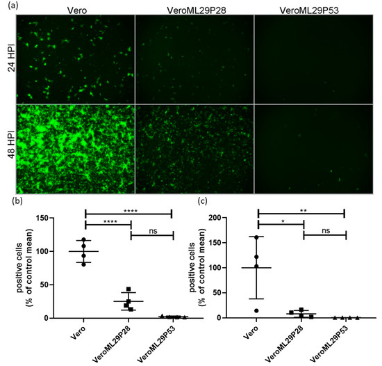 Suppression of LCMV RNA replication/expression in ML29 persistently infected Vero cells. Regular Vero cells were infected with r3LCMV-GFP/GFP expressing GFP from NP and GPC promoters located in parental and additional S RNA. (a) Replication of recombinant viral S RNAs resulted in effective expression of a GFP reporter gene at 24 and 48 h after infection. In ML29 persistently infected cells (P28 and P53, middle and right panels, respectively) replication of recombinant S RNAs and expression of GFP was deeply suppressed depending on Vero cell passage, VeroML29P28 vs. VeroML29P52. Images (n = 4 per cell line, per time point comprised of 2 each from 2 different dilutions) were quantified by manual counting of green cells. The percentage of positive cells compared to the average number of positive Vero cells at (b) 24 HPI and (c) 48 HPI are represented. Error bars represent the mean with standard deviation. One-way ANOVA with Tukey’s multiple comparison test was used to determine significance: * p < 0.05, ** p < 0.01, **** p < 0.0001, ns—no statistically significant difference.