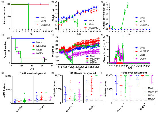 CBA/J mice were inoculated IC with 103 PFU of ML29 (green), a qRT-PCR equivalent dose of ML29P50 (red), or mock inoculated with PBS (blue) and followed for two weeks for (a) survival, (b) weight, and (c) clinical manifestations. Survival curves are significantly different (p < 0.0001) by Mantel–Cox Log-rank test. STAT-1-/- mice were inoculated IP with 103 PFU of ML29 (green), a qRT-PCR equivalent dose of ML29P50 (red), 103 PFU of MOPV (purple), or mock inoculated with PBS (blue) and followed for two months for (d) survival, (e) weight, and (f) clinical manifestations. Sixty-two days post inoculation, mice were tested for hearing loss by acoustic startle with a sound generated at (g) 20 dB, (h) 30 dB, or (i) 40 dB greater than the background noise of the room. Following the startle tone, the movement of the mouse was tracked with a digital pressure transducer, which recorded pressure signal as millivolts. The dashed line represents the sensitivity threshold used to distinguish response to the sound from non-specific signal. Values above the dashed line were able to hear the startle inducing tone.