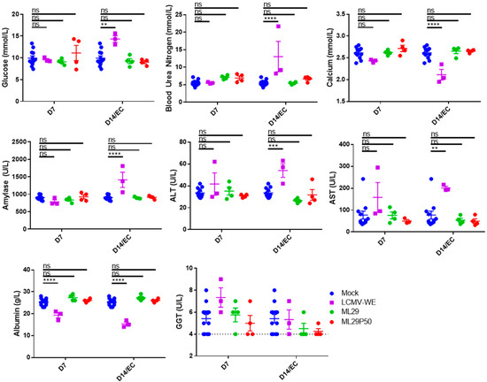 Hartley guinea pigs (n = 4 per time point) were inoculated with 103 PFU of ML29 (green circles) or ML29P50 supernatant containing 103 PFU-qRT-PCR equivalents (red circles). Blood chemistry values were measured with a Piccolo Xpress analyzer including glucose, blood urea nitrogen, calcium, amylase, ALT, AST, Albumin, and GGT. As a positive control for arenavirus hemorrhagic-fever-like disease, a group (n = 3) of guinea pigs was inoculated with 101 PFU of LCMV-WE (purple squares). All the animals in the LCMV-WE group succumbed to infection between day 10 and day 12 and EC data is presented in place of day 14 measurements. A group (n = 4) of guinea pigs was sham-inoculated and results from days 7, 14, and 21 were pooled as a comparison for experimental animals (and is shown repeated as blue circles for both D7 and D14 samples). ** p < 0.01, *** p < 0.001, **** p < 0.0001, or not statistically significant (ns) by one-way ANOVA with Dunnett’s post-hoc comparison to mock.