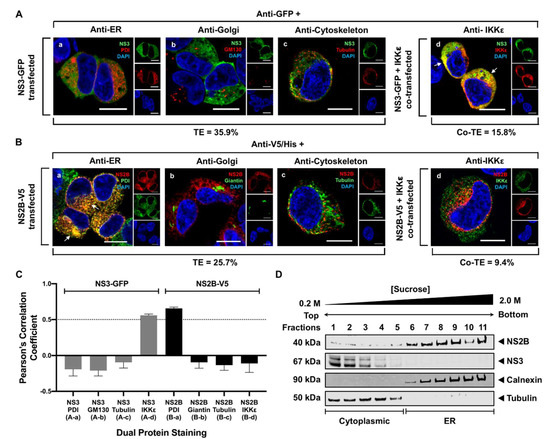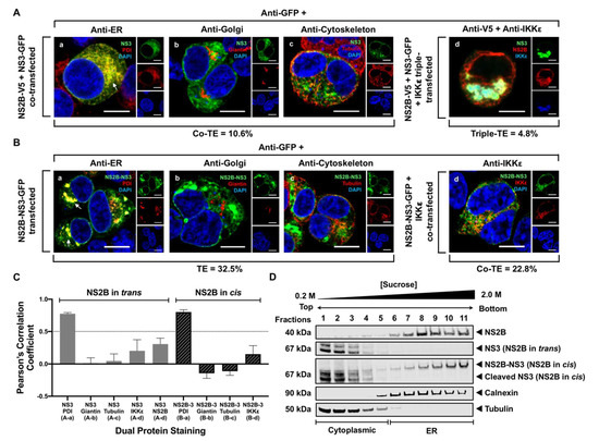 The following are available online at https://www.mdpi.com/1999-4915/13/2/216/s1, Figure S1. NS4A or NS4B does not recruit NS3 to the ER. Figure S2. NS3 shows slightly higher colocalization with NS2B than with IKKε. Figure S3. Fused Tag Does Not Influence the Proteolytic Activity of NS3 when NS2B is provided in trans.