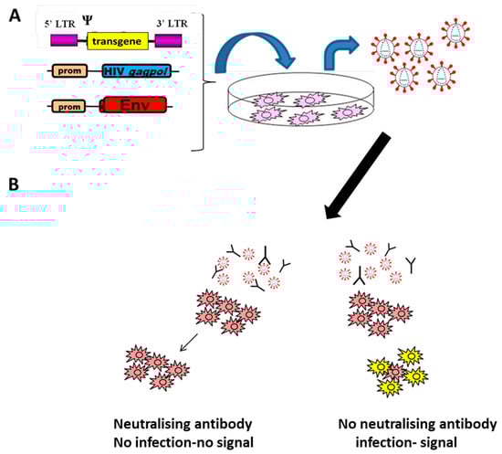 Serological assays are used for the evaluation of the immune response, specifically antibodies, in serum, plasma or other body fluids. Detection of pathogen-specific IgM can aid the diagnosis of acute infection in support of the preferred molecular methods detecting the genetic material (i.e., nucleic acid amplification-based techniques). This is particularly important for those infections characterised by a short viremia, such as Zika [15], or those in resource-limited areas. During the coronavirus disease 2019 (COVID-19) global pandemic in 2020, serology was considered a critical tool to understand the real impact of COVID-19, as many cases were asymptomatic or unreported, and to guide government policies [16,17]. Other applications of serological assays involving the use of pseudotyped LVs such as evaluation of vaccines and therapeutics are described in more detail below, and Table 1 is a summary of the LV serological applications discussed. There are many types of serological assays, which, in a simplistic manner, can be grouped into detection of either binding or neutralising antibodies. The enzyme-linked immunosorbent assay (ELISA) is the most traditional method for determining the presence of specific binding antibodies in a serological sample. Usually, recombinant proteins or peptides are the target antigens, but whole virus-based ELISAs have been developed [18,19,20], opening the possibility to replace the real virus with a pseudotyped LV, although restricting the ELISA specificity to the Env. The applications of pseudotyped LVs are more obvious in those assays that can detect neutralising antibodies (NAbs), as these are usually directed against the viral envelope proteins, which interact with the cellular receptor. Traditional assays such as the plaque reduction neutralisation test (PRNT) and hemagglutination inhibition (HI) assays require the use of a live virus, often at containment level 3 or 4 laboratories. Neutralisation assays which employ a pseudotyped LV offer the great advantage of a lower containment platform with a reduced risk for the scientist. The pseudotyped LV system allows laboratories which cannot afford the cost of a high-containment level laboratory, or which have difficulties in importing specific pathogens, to perform neutralisation assays. An added benefit of this system is that a marker gene such as green fluorescent protein (GFP) or luciferase (Luc), as a transgene, facilitates the infectivity readout, making the assay easier to perform and often more time-efficient.