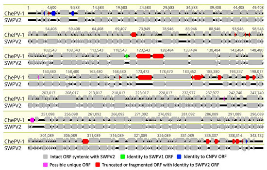 Comparative genomic illustration of the novel Cheloniid poxvirus 1 (ChePV-1) with shearwater poxvirus-2 (SWPV2). Sequence alignment using MAFFT in Geneious (version 10.2.2) was performed to compare open reading frames (ORFs) between cheloniid poxvirus (ChePV-1, GenBank accession no. MT799800) and shearwater poxvirus-2 (SWPV2, GenBank accession no. KX857215). The arrows symbolize genes and open reading frames (ORFs), indicating their direction of transcription. Each gene or ORF is color-coded, as indicated by the color key in the legend.