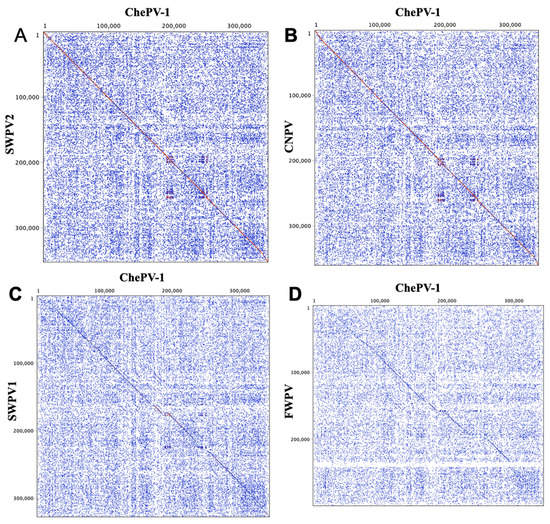 Dot plots of the ChePV-1 genome (x-axis) vs. other selected sequenced poxvirus genomes (y-axis). (A) ChePV-1 vs SWPV2, (B) ChePV-1 vs canarypox virus (CNPV) (C) ChePV-1 vs shearwaterpox virus-1 (SWPV1) and (D) ChePV-1 vs fowlpox virus (FWPV). The Classic color scheme was chosen in Geneious (version 10.2.2) for the dot plot lines according to the length of the match, from blue for short matches, to red for matches over 100 bp long. Window size = 12.