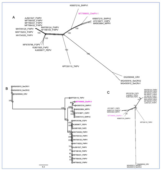 Phylogenetic analyses using selected full-genome sequences of ChPVs and concatenated amino acid sequences of nine selected conserved ChPVs genes supported the inclusion of the newly assembled ChePV-1 as a likely avipoxvirus. In the resulting tree, based on complete genome sequences of ChPVs, the novel ChePV-1 was positioned in a distinct subclade (bootstrap support 100%) with CNPV with the recently isolated SWPV2 and MPPV, demonstrating that the ChePV-1 likely originated from a common ancestor of these viruses (Figure 4A). By also building phylogenetic trees using concatenated amino acid sequences of nine selected conserved ChPVs genes, we observed that the novel ChePV-1 placed with SWPV1 in a distinct subclade with strong bootstrap support (89%) (Figure 4B,C). Using the same set of concatenated protein sequences, the maximum inter-subclade sequence identity values between the novel ChePV-1 and other poxviruses were >91.70%, 91.29%, 91.26% and 91.21% (SWPV1, CNPV, SWPV2 and MPPV, respectively). There was no close relationship phylogenetically nor at sequence identity level with the sequenced poxviruses of reptilian origin (e.g., CRV and SwCRV).