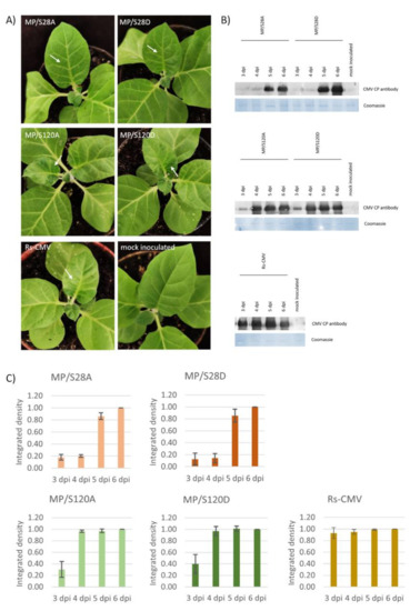 Symptom development on Nicotiana tabacum cv. Xanthi induced by MP/S28A, MP/S28D, MP/S120A, MP/S120D and wild type Rs-CMV. (A) Systemic symptoms on N. tabacum cv. Xanthi plants 5 days post inoculation (dpi). Arrows indicate the recognized symptoms. (B) Western blot analysis of coat protein (CP) accumulation in the systemically infected leaves 3–6 dpi. The equal protein loading was verified with Coomassie staining. (C) Bar diagrams representing the relative integrated density of the Western blot analysis. Standard deviations from three independent experiments are represented.