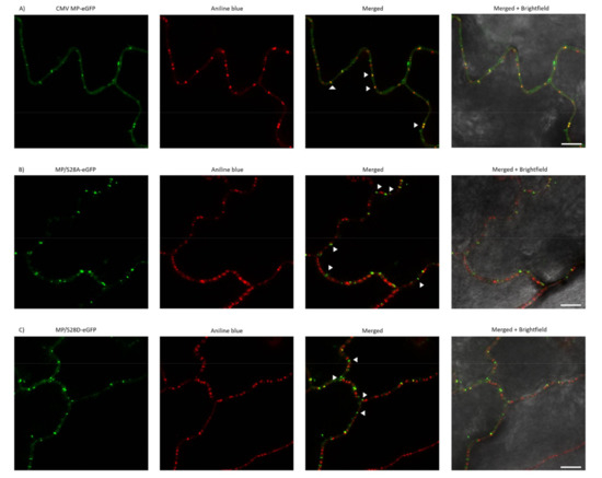 Subcellular localization of wild type and mutant MP-eGFP constructs on Nicotiana benthamiana. (A–C) MP-eGFP and mutant constructs MP/S28A-eGFP and MP/S28D-eGFP were transiently expressed in N. benthamiana leaves. Aniline blue staining served as a plasmodesmata marker. Images were taken 24–48 h after agroinfiltration using a confocal microscope. For better visualization, eGFP fluorescent and aniline blue images were false colored as green and red, respectively. Arrowheads indicate the punctate structures. Scale bar: 10 µm.