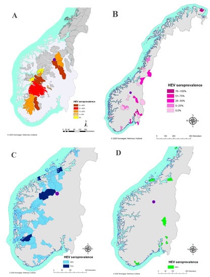 Overview of the origin of samples and prevalence results for Hepatitis E in this study. (A) Eurasian tundra reindeer (Rangifer tarandus); (B) moose (Alces alces); (C) red deer (Cervus elaphus); (D) European roe deer (Capreolus capreolus). All muskoxen (Ovibos moschatus) originated from Dovrefjell National Park, and this area is identified with a purple circle on every map. For information on the geographic units used on the maps, please refer to a higher format version of these in the Supplementary Materials (Supplementary Figure S1A–D). Note that for some cases, the geographical origin was not recorded; therefore, the total number of cases does not necessarily coincide with the number of cases represented.