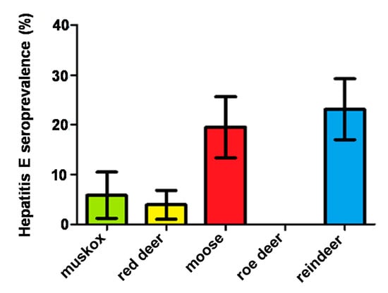 - Roth, A.; Lin, J.; Magnius, L.; Karlsson, M.; Belák, S.; Widén, F.; Norder, H. Markers for Ongoing or Previous Hepatitis E Virus Infection Are as Common in Wild Ungulates as in Humans in Sweden. Viruses 2016, 8, 259. [Google Scholar] [CrossRef] [PubMed]