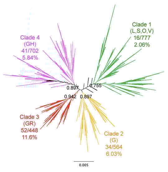 Phylogenetic analysis of SARS-CoV-2 genome sequences from our cohort revealed four well-resolved clades (Figure 1). The overall mortality rate in this cohort was 5.74% (144/2508). However, patient mortality varied significantly among the identified clades (X2 = 47.93, d.f. = 3, p < 0.0001), ranging from 2.06% [95%CI 1.28–3.32] for Clade 1 up to 11.61% [95%CI 8.97–14.91] for Clade 3, with Clades 2 and 4 having intermediate mortality rates (6.03% [95%CI 4.35–8.31] and 5.84% [95%CI 4.34–7.83], respectively). These results suggested an association of viral clades with mortality.