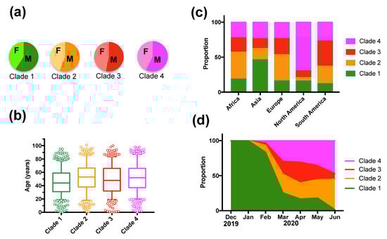 However, deceased patients were also of older age (66.8 ± 1.31 vs. 48.2 ± 0.4 years for survivors, t-test, p < 0.0001), and mortality rates varied significantly according to the geographic region (X2 = 61.26, d.f.= 4, p < 0.0001), time of year (X2 = 74.35, d.f.= 6, p < 0.0001), and tended to be higher in males (X2 = 2.37, d.f. = 1, p = 0.12) (Supplementary Table S3). Therefore, we adjusted for these variables in a Generalized Linear Model (GLM), which confirmed that patient mortality was significantly associated with SARS-CoV-2 clades (Effect test p < 0.0001), together with patient age (p < 0.0001), geographic region (p < 0.0001), time of year (p < 0.0001), and sex (p = 0.004) (Supplementary Table S4). The sex-ratio of infections was similarly biased toward more males for all clades (X2 = 4.02, d.f. = 3, p = 0.25, Figure 2A). Patient age distributions were similar among the Clades, although the mean age was significantly lower for Clade 1 (p < 0.01, Figure 2B). There was a significant difference in the proportion of the respective clades among geographic regions (X2 = 522.65, d.f. = 12, p < 0.0001), and Clade 1, associated with a lower mortality rate, was predominant in Asia, and Clade 4 was predominant in North America (Figure 2C). The proportion of each Clade also varied over time (X2 = 821.54, d.f. = 18, p < 0.0001) (Figure 2D). Initial infections were caused by virus from Clade 1, which started to be replaced by the other Clades in February 2020, and became nearly absent from this cohort by June 2020 (1.45% of all sequences). Clade 3, associated with a high mortality rate, presented an initial increase in proportion in March and April 2020, but decreased since then, and Clade 2 and 4 were the most frequent clades in the cohort as of June 2020 (Figure 2D). However, there were regional variations in the changes in Clade proportions over time, and the only constant observation was the progressive replacement of Clade 1 (Figure 3).
