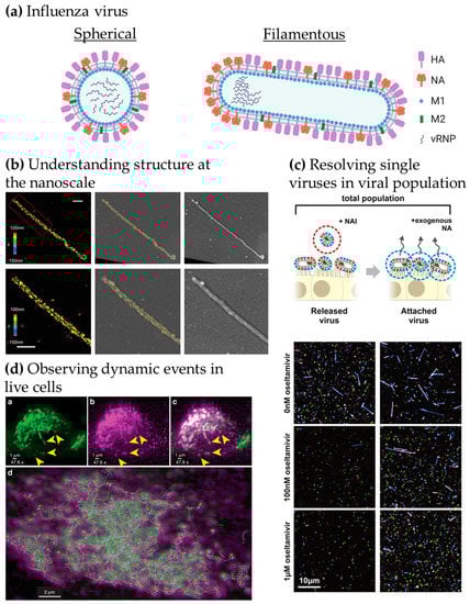 We identified three key opportunities for advanced fluorescence microscopy techniques to provide novel insights into influenza virus biology, as highlighted in Figure 1b–d: (i) Understanding virus structures and associated host cell components at the nanoscale [,,,], (ii) resolving individual viruses among large populations of viruses [,] and (iii) observing dynamic processes in real-time [,].