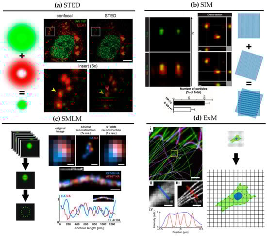SRM comprises optical imaging techniques that offer resolution beyond the diffraction limit of light (~250 nm). Figure 2 shows graphical explanations and examples of the main SRM techniques applied to the study of influenza virus replication.