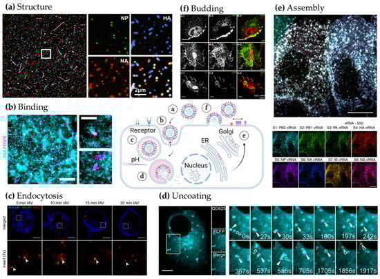 Our review summarizes recent applications of SRM and quantitative advanced microscopy techniques to study influenza virus replication. It highlights important techniques such as SRM for structural studies of molecular assemblies either in the virus particles [] or in interactions with host-cell components [], SPT via QD labelling for tracking and trafficking dynamics [], single-molecule imaging via smFRET to study conformational dynamics of HA [] and MuSeqFISH) to study the bundling of viral genome segments during assembly [], all of which provided important new mechanistic insights into influenza virus replication. In addition, the application of live-cell approaches, in particular SPT of different viral components (such as vRNPs) [] and single-virus studies [,], enabled by novel labelling strategies such as QD and small enzymatic tagging, have uncovered important dynamic behaviours of influenza virus infection in cells, highlighting the complexity of trafficking and assembly [,], and the shape-biased effect of oseltamivir on pleiomorphic viruses []. This diversity can only be uncovered by advanced microscopy techniques capable of high sensitivity and molecular specificity, combined with high spatial and temporal resolution.
