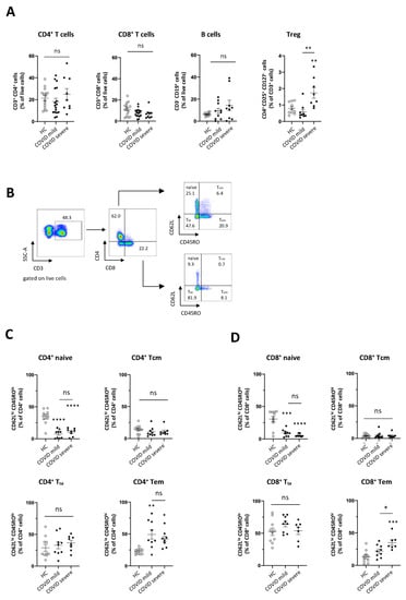 The immune system has been proposed to play an important role for the pathogenesis of COVID-19 [7,24,25]. To dissect alterations of the immune system in patients with COVID-19, we analysed subsets of adaptive and innate immune cells using multicolour flow cytometry in a cohort of 43 hospitalised COVID-19 patients with either mild (22 patients, 51%) or severe (21 patients, 49%) clinical course, and compared them to 25 healthy volunteers (see Table 1 for detailed characteristic). Patients with mild COVID-19 were treated on a general infectious diseases ward, whereas all patients with severe COVID-19 were admitted to intensive care unit (ICU). Oxygen therapy <15L O2 was required by 27% of patients with mild COVID-19. Amongst the 21 patients with severe COVID-19, 19 patients (90%) required invasive ventilation, of which 5 were treated with additional extracorporeal membrane oxygenation (ECMO) (Table 1). We first analysed the frequency of conventional CD4+ and CD8+ T cells, as wells as B cells and CD4+CD25+CD127− regulatory T cells (Treg, see gating strategy in Figure S1A) in a PBMC pool isolated from peripheral blood of COVID-19 patients with mild and severe course of disease. As shown in Figure 1A, we did not observe significant differences in total CD4+ T cell, CD8+ T cell or B cell frequency in peripheral blood of COVID-19 patients compared to healthy controls, irrespective of disease severity. In contrast, Treg frequency was significantly increased in patients with severe COVID-19, compared to healthy controls. Interestingly, Treg frequency in patients with severe COVID-19 was also significantly increased in comparison to patients with mild COVID-19 (Figure 1A). The use of multicolour flow cytometry further allowed to define subsets of adaptive T cells by expression of CD45RO and CD62L (see Figure 1B for gating strategy) as naïve, central memory (Tcm), effector memory (Tem) and terminally differentiated effector T cells (Tte). We observed a significant decline of naïve CD4+ and CD8+ T cells in patients with both mild and severe COVID-19. Moreover, CD8+ Tem cells were significantly increased in patients with severe COVID-19, and CD4+ Tem cells were significantly increased in COVID-19 patients with either mild or severe COVID-19. In contrast, CD4+ and CD8+ Tcm cell, as well as Tte frequency was unchanged in COVID-19 patients irrespective of the course of disease (Figure 1C,D). These data indicate changes in the adaptive immune system pointing towards activation of an adaptive immune response in patients with COVID-19.
