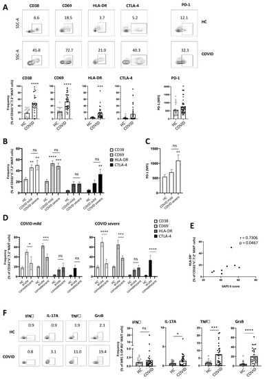 MAIT cells of COVID-19 patients express high levels of activation markers and cytokines ex vivo. (A–D) Ex vivo expression of surface activation markers in MAIT cells from peripheral blood of COVID-19 patients and healthy controls (HC); (E) Spearman correlation between expression of HLA-DR in MAIT cells in peripheral blood of COVID-19 patients and SAPS II score at day of sampling; (F) Ex vivo intracellular cytokine expression in MAIT cells from peripheral blood of COVID-19 patients and HC, representative data from one patient and summary data; (A,E,F) each symbol represents one patient. (A) CD38: HC n = 18 and COVID n = 30; CD69: HC n = 21 and COVID n = 38; HLA-DR: HC n = 21 and COVID = 35; CTLA-4: HC n = 20 and COVID n = 36; PD-1: HC n = 23 and COVID n = 34. (B) HC n = 13, COVID mild n = 22 and COVID severe n = 18; (C) HC n = 26, COVID mild n = 17 and COVID severe n = 9; (D) HC n = 19, COVID acute n = 13 and COVID convalescent n = 9; (E) n = 8; (F) IFNγ: HC n = 19 and COVID n = 33; IL-17A: HC n = 23 and COVID n = 33; TNFα: HC n = 23 and COVID n = 34; GrzB: HC n = 23 and COVID n = 34. Data are presented as mean ± SEM and were pooled from six (A–D) or four (E) independent experiments; * p < 0.05, ** p < 0.01, *** p < 0.001 and **** p < 0.0001 vs. HC or as indicated. Data were assessed using unpaired t-test (A,F), two-way analysis of variance (ANOVA) with Tukey’s multiple comparisons test (B,D) or one-way ANOVA with Tukey’s multiple comparisons test (C). ns = not significant.