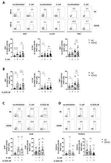 To investigate the function of MAIT cells in COVID-19 patients, we analysed MAIT cell response to in vitro stimulation. Since MAIT cells recognise vitamin B metabolites expressed by various strains of bacteria as antigens [11], they can be stimulated in vitro by incubation with Escherichia coli (E. coli) [21]. Hence, we incubated PBMCs from COVID-19 patients and healthy controls with paraformaldehyde-fixed E. coli for 24 h and analysed intracellular cytokine expression of MAIT cells. As shown in Figure 4A, MAIT cells both from COVID-19 patients and from healthy controls significantly upregulated IFNγ expression following E. coli stimulation. In contrast, MAIT cells failed to upregulate expression of IL-17A and TNFα upon E. coli stimulation (Figure 4A). Although MAIT cells cannot recognise viral antigen, it has been shown that MAIT cells are activated in viral infections, orchestrate antiviral responses and limit viral replication in vitro [20,22]. Activation of MAIT cells in viral infections is mediated by T cell receptor (TCR)-independent activation by IL-12 and IL-18 [20]. We therefore analysed MAIT cell response to in vitro stimulation with IL-12 and IL-18. Figure 4B and Figure S4A show that MAIT cells from both COVID-19 patients and healthy controls significantly upregulate IFNγ expression upon 24 h stimulation with IL-12 and IL-18. In contrast, upregulation of IL-17A and TNFα was impaired in MAIT cells from COVID-19 patients compared to healthy controls. Next, MAIT cell cytokine expression in response to in vitro stimulation was investigated in MAIT cells isolated from patients with mild or severe COVID-19. We observed a significantly higher IFNγ expression in MAIT cells from patients with severe COVID-19 in response to IL-12/IL-18, but not E. coli stimulation, compared with MAIT cells from patients with mild COVID-19 (Figure S4B). In contrast, expression of TNFα and IL-17A was similar in MAIT cells from patients with mild and patients with severe COVID-19, irrespective of the way of stimulation (Figure S4B). It has been shown previously that MAIT cells develop a cytotoxic profile characterised by expression of cytolytic proteins, such as granzyme B and perforin, upon stimulation [14,30], thereby rendering them able to kill bacterially infected cells [14,15,16,17]. We therefore analysed the expression of granzyme B and perforin in MAIT cells from COVID-19 patients and healthy controls upon in vitro stimulation with E. coli, or IL-12/IL-18, respectively. While MAIT cells from healthy controls significantly upregulated both granzyme B and perforin expression upon E. coli stimulation, MAIT cells from COVID-19 patients expressed high levels of granzyme B and perforin ex vivo (Figure 3F and Figure 4C), but were unable to upregulate expression of both cytolytic proteins upon E. coli stimulation (Figure 4C,D). Similarly, MAIT cells from COVID-19 patients failed to upregulate granzyme B expression and downregulated perforin expression upon IL-12/IL-18 stimulation (Figure 4C,D). Solely MAIT cells isolated from patients with severe COVID-19 were able to significantly upregulate granzyme B expression upon IL-12/IL-18 stimulation and expressed significantly higher levels of granzyme B compared to MAIT cells from patients with mild COVID-19 (Figure S4C). Overall, these data suggest that the function of MAIT cells is severely altered in patients with COVID-19 and may result in an impaired antimicrobial capacity.