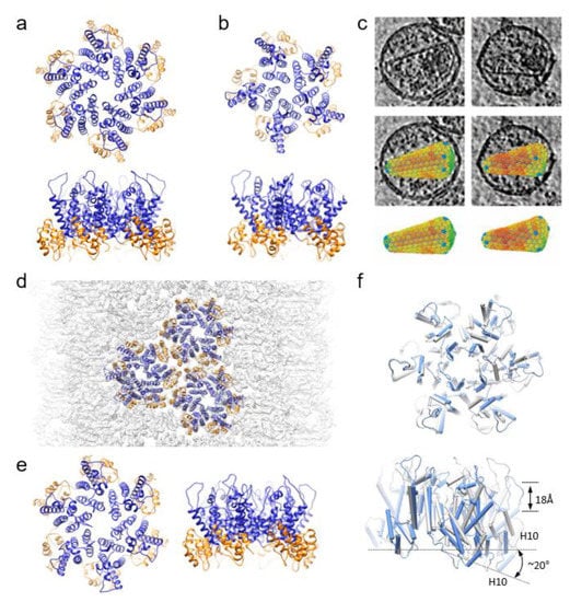 Interactions between the subunits of CA, in both intra- and intermolecular contexts, are crucial for the formation of both CA hexamers and pentamers, but the understanding of these interactions has evolved significantly over the years. In a relatively early crystal structure of Cys-crosslinked CA hexamers, Met39 and Ala42 comprise elements of a hydrophobic interface that forms part of an 18 helix barrel [,]. The analogous barrel in the Cys-crosslinked pentamer crystal was shown to have 15 helices, with largely the same aliphatic contact (Figure 1b) []. This arrangement of the pentamer, however, has since been shown to be an artifact of the crosslinking. CryoET subtomogram averaging has subsequently shown a substantially different and more native pentameric structure with 10 helices in the barrel [].