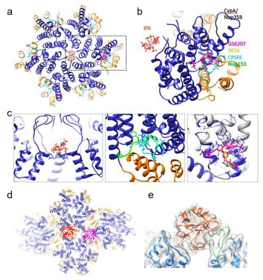 PF3450074 (a Pfizer compound colloquially termed PF74) was first reported to exhibit antiretroviral activity in 2010, in conjunction with a crystal structure that showed it binds the CA NTD []. Subsequently, it was shown to competitively bind to the same site where CPSF6 interfaces with the CA capsomere []. A further step in determining the mechanism of action for PF74 came about when new crystal structures of the compound bound to a CA hexamer showed that it occupied a binding pocket between the NTD of one protomer and the CTD of the adjacent one (Figure 2a–c) [,]. These same studies confirmed that CPSF6 interfaces with the hexamer at the same location, as does Nup153. Recent studies have shown evidence that PF74 binding excludes viral replication complexes from nuclear speckles, demonstrating the importance of the CA-CPSF6 interaction in targeting viral DNA integration [].