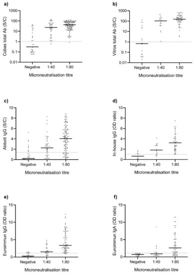Walker, G.J.; Naing, Z.; Ospina Stella, A.; Yeang, M.; Caguicla, J.; Ramachandran, V.; Isaacs, S.R.; Agapiou, D.; Bull, R.A.; Stelzer-Braid, S.; et al. SARS Coronavirus-2 Microneutralisation and Commercial Serological Assays Correlated Closely for Some but Not All Enzyme Immunoassays. Viruses 2021, 13, 247. https://doi.org/10.3390/v13020247