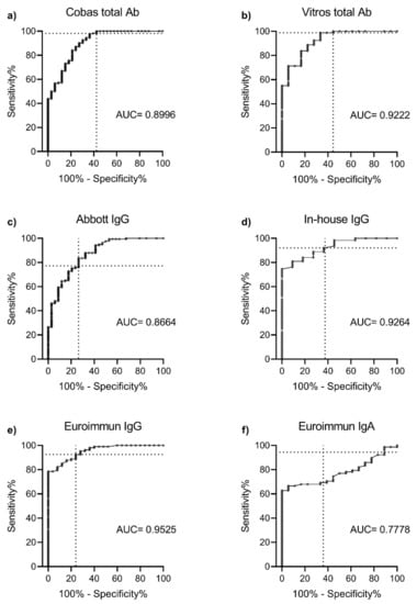 - Haselmann, V.; Kittel, M.; Gerhards, C. Comparison of test performance of commercial anti-SARS-CoV-2 immunoassays in serum and plasma samples. Clin. Chim. Acta 2020, 510, 73–78. [Google Scholar] [CrossRef]