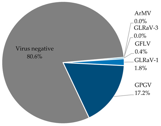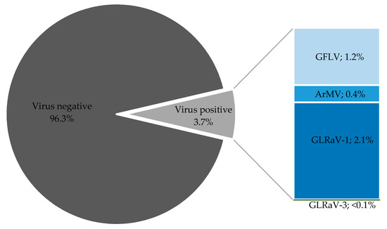 Only 3.7% of samples were found to be virus infected in 2009–2020. The left part of the chart shows the overall amounts of virus-negative (dark gray color) and virus-positive (light gray color) scion samples. The right chart represents the proportions of viruses found inside the 3.7% of virus-infected scion samples. Samples were tested for Grapevine fanleaf virus (GFLV); Arabis moasic virus (ArMV); Grapevine leafroll asscoiated virus 1 (GLRaV-1); Grapevine leafroll associated virus 3 (GLRaV-3). Mixed infections were not considered.