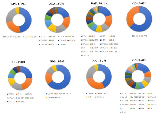 Samples that did not contain poliovirus were specifically selected in order to focus on non-polio EV serotypes and avoid biosafety containment issues. Although, it cannot be completely ruled out, we do not expect bias in EV serotype distribution due to selecting poliovirus-negative samples in our study. First, the workflow used for all samples was identical, following WHO Guidelines for environmental surveillance []. Second, both polio and non-polio EVs have similar structural and physicochemical properties and are expected to be affected by dilution and inactivation effects in sewage contaminated water in a similar manner. Hence, identification of any EV is used and has proven to be a good indicator of good environmental sensitivity for poliovirus detection regardless of EV serotypes present in the sample []. Lastly, recent studies suggest there is little interference between the circulation of different EV serotypes in the same population with circulation of specific EV serotypes not having a major impact on the transmission of other EV serotypes []. Indeed, several other factors do seem to have an effect on the detection of EVs in environmental samples such as the nature of the sewage network, the appropriateness of the sampling site, the catchment population, and the physicochemical properties of sewage []. Samples used in this study were taken from water streams that are often contaminated with sewage, but levels of contamination and catchment population numbers are difficult to estimate making that comparisons between sites more difficult. Water concentrate samples were shipped from the Polio Laboratory in Nigeria to the National Institute for Biological Standards and Control (NIBSC) in dry ice and were stored at −80 °C until use. Whole-capsid EV sequences present in water concentrates were determined by NGS analysis of whole-capsid PCR products using methods described in Section 2.2, Section 2.3 and Section 2.4. These methods have been extensively validated using reference EV strains, laboratory-made EV mixtures, clinical samples, and water concentrates from different locations in comparison to the sequences determined by the Sanger method [,,].