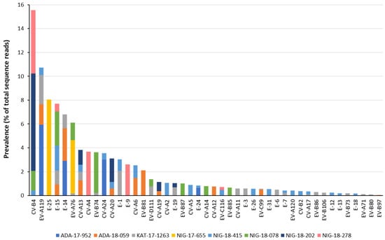 Overall prevalence of EV serotypes in water samples from Nigeria. Filtered NGS reads from RT-PCR products from the water concentrates were mapped to consensus sequences obtained for each sample. The proportions of NGS reads mapping to each EV serotype are shown. The sample source is shown in different colors as indicated at the bottom of the figure.