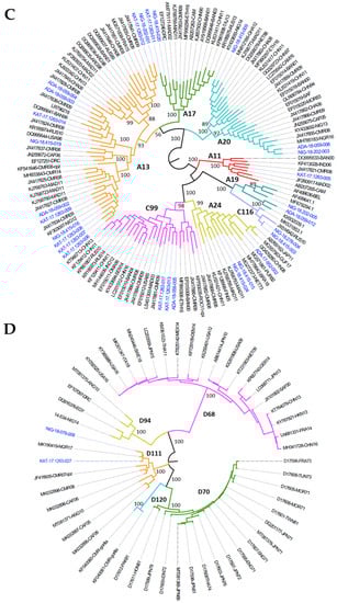 Phylogenetic analysis of VP1 sequences of EV strains from species (A–D) (panels A–D in the figure) identified in water samples from Nigeria. Phylogenetic relationships between EV sequences were inferred by using the Maximum Likelihood method and Tamura-Nei model using MEGA X software []. Initial tree(s) for the heuristic search were obtained automatically by applying Neighbor-Join and BioNJ algorithms to a matrix of pairwise distances estimated using the Maximum Composite Likelihood (MCL) approach, and then selecting the topology with superior log likelihood value. The tree is drawn to scale, with branch lengths measured in the number of substitutions per site. The percentage of replicate trees in which the associated taxa clustered together in the bootstrap test (1000 replicates) are shown next to the branches. VP1 sequences from Nigerian strains in this study are shown in blue text. Abbreviations for country names are shown in the Abbreviations section at the bottom of the manuscript.