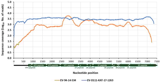 Genome coverage of EV-D94-14.534 strain from the Republic of Niger (orange line) and EV-D111-KAT-1263 strain from Nigeria (blue line) by NGS analysis. Filtered reads were mapped to the final consensus sequences generated by de novo assembly. The number of sequence reads at each nucleotide position is shown. The location of viral genes is indicated.