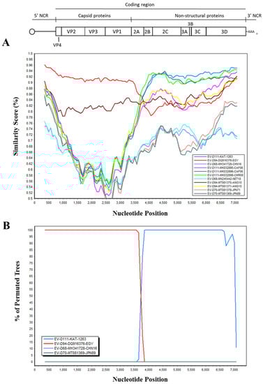 Recombination analysis of EV-D94-14-534 strain from Niger. Plot of similarity (A) and bootscanning analysis (B) using EV D whole-genome sequences from the NCBI sequence database. The EV genetic map is shown in the top panel. The analyses were conducted using SimPlot version 3.5.1 with the Kimura distance method and a sliding window of 700 base pairs moving in steps of 70 nucleotides. The genome of EV-D94-14-534 strain served as a query sequence.