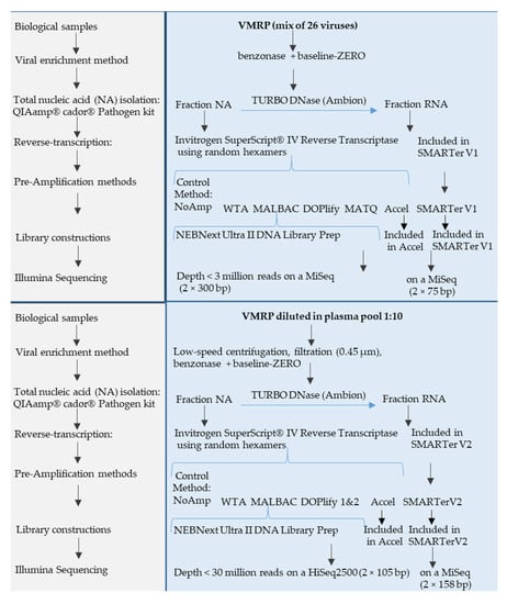 In addition, in order to evaluate the impact of background host nucleic acids on viral detection, the VMRP was diluted into human plasma. After this first step of evaluation, two of the methods were selected, combined, optimized and evaluated using five standard viral stocks endorsed as WHO 1st International Virus Reference Standards for Adventitious Virus Detection in Biological Products by NGS technologies (WRVS). Results were compared to a non-pre-amplification-based method in the NA fraction.