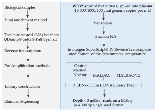 Experimental design with WHO reference virus stocks (WRVS). The experiment was designed to quantify the viral detection level of two MALBAC-based methods compared to the protocol without pre-amplification (NoAmp). The NA fraction of WRVS (mix of quantified reference virus stocks) was used at a final concentration of 104, 103 or 102 viral gc/mL of plasma matrix.