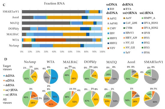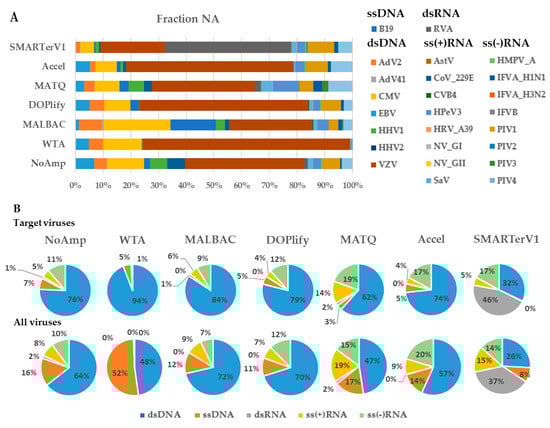 In the NA fraction (Figure 3B) for all viruses, except for SMARTerV1 that is dedicated to RNA, the dsDNA group was the most represented (47–72%). The ssDNA group represented 11–17% of the total counts, except for WTA that reached 52%. Accel, DOP, and MALBAC amplification methods failed to detect dsRNA viruses whereas SMARTerV1 showed the highest percentage of dsRNA viruses (37%). NoAmp and MATQ detected only 2% of dsRNA viruses among total viral sequences. All methods, except WTA, detected 7–19% and 7–20% sequences corresponding to the ssRNA(+) and the ssRNA(-) groups, respectively.