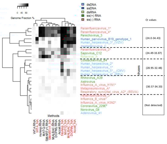 An estimate by qPCR of each viral genome abundance was previously described and six viruses among the VRMP were not detectable []. The threshold Cycle (Ct) (Table S1) are reported in the heatmap of genome fraction in Figure 4.