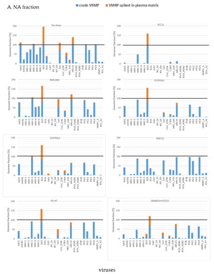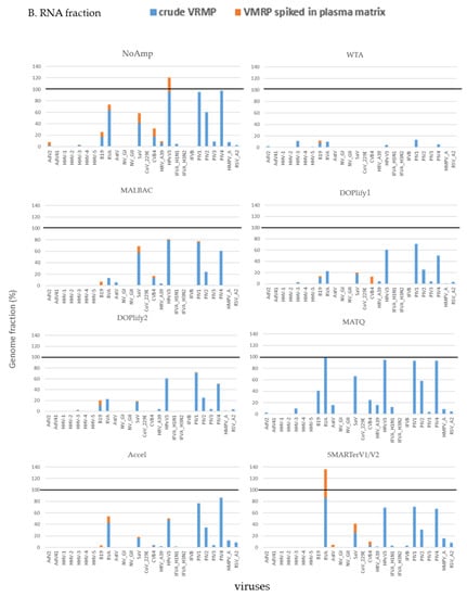 In order to mimic the viral detection within a biological matrix, the VRMP was added to plasma from healthy donors at a ratio 10:1. In these conditions, none of the methods recovered all Paramyxoviridae members, even SMARTerV2 that included a removal step of ribosomal and mitochondrial cDNA following cDNA synthesis. NoAmp and MALBAC were the only methods capable of detecting the two viruses that were already the best covered in the absence of plasma (PIV-1 and PIV-4) in the NA fraction. In the RNA fraction the number of RNA viruses detected was smaller than in NA fraction and only MALBAC detected PIV-1. The upstream treatment of plasma samples (low speed centrifugation, and filtration through 0.45 µm membranes) may have played a role in the loss of these viruses, as suggested by Li et al., 2015 []. Another explanation of the decrease of single-stranded RNA viruses could be the DNase treatment post extraction to get the DNA-free RNA fraction, which could slightly degrade RNA, or the purification step by column filtration.