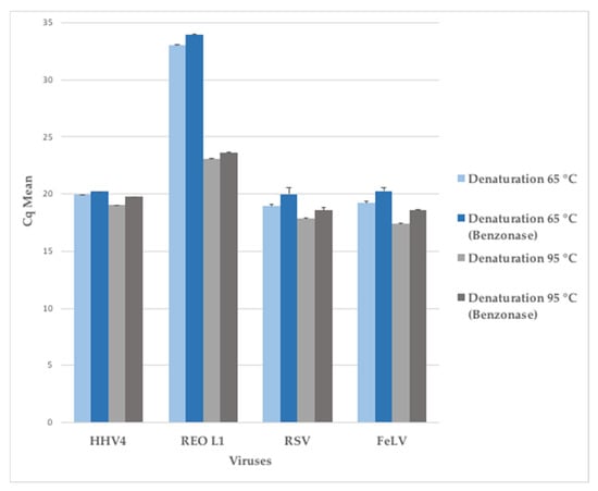 Effect of denaturation temperature of dsRNA virus prior to reverse-transcription on the treated sample with or without benzonase. Each viral stock (HHV-4, REO L1, RSV, FeLV) was diluted to 5 × 106 genome-copies per mL for the NA isolation.