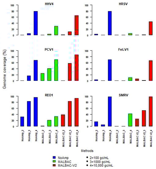The coverage of the viral genomes was assessed by mapping (Figure 7). MALBAC-V2 outperformed MALBAC and was close to the non-pre-amplified method at a spike concentration of 104 gc/mL of plasma. The genome fraction of all viruses was between 50 and 98%. At 103 viral genome copies per mL, the genome coverage was more heterogeneous. PCV1 and REO1 were the best covered viruses, especially with MALBAC-V2. At 102 genomes copies per mL, the genome fraction dropped to less than 10% for all viruses, except for REO1 virus detected with NoAmp and MALBAC-V2.