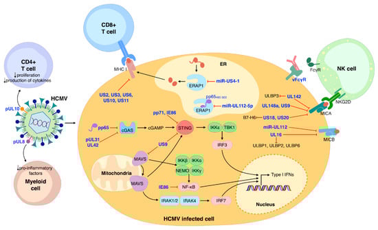 Adaptive immunity is critical for the control of primary HCMV infections, which can later on be enhanced by clonal expansion of activated CD4+ and CD8+ T-cells []. To counteract this response, HCMV employs five viral glycoproteins (i.e., US2, US3, US6, US10, and US11), all capable of interfering with the presentation of the major histocompatibility (MHC) class I antigen [] and the recognition of antigenic peptides by CD8+ T-cells. Concurrently, an important role in regulating the production of antigenic peptides and inhibiting the production of viral epitopes [] is played by HCMV miR-US4-1, which, by targeting the endoplasmic reticulum aminopeptidase 1 (ERAP1), inhibits the CD8+ T-cell response. Likewise, HCMV miR-UL112-5p appears to downregulate ERAP1 expression, thereby inhibiting the processing and presentation of HCMV pp65 to cytotoxic T lymphocytes (CTLs) [,]. Finally, upon THP-1 cell infection, HCMV pUL8 reduces the levels of pro-inflammatory factors so as to inhibit inflammation [], whereas HCMV pUL10 mediates immunosuppression by reducing T-cell proliferation and cytokine production [].