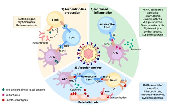 Despite the great effort, researchers have not yet been able to discriminate whether HCMV is an initiator of AD or an epiphenomenon that may simply exacerbate the course of ADs. In this regard, multiple mechanisms have been proposed to explain HCMV-induced autoimmunity. Through a mechanism defined as “molecular mimicry”, viral epitopes that are highly similar to host determinants may induce the development of antibodies that attack the self at the level of specific tissues, as it has been hypothesized for the viral tegument protein pp65 in SLE patients []. Intriguingly, upon HCMV infection, immunocompetent hosts tend to develop an autoimmune reaction through the generation of autoantibodies, which occurs more frequently in those individuals with a systemic involvement []. HCMV-infected bone marrow transplant recipients quite often develop organ-specific autoantibodies against the human aminopeptidase CD13 [,] or common phospholipid [], whereas solid organ transplant recipients develop non-organ-specific autoantibodies []. Accordingly, hypergammaglobulinemia, cryoglobulinemia, and autoantibody production are common features of HCMV-driven mononucleosis [,]. This unspecific hyperactivation of humoral immunity is thought to represent a mechanism of viral immune evasion, because it curbs host B-cell responses. Once the tissue is infected, activated antigen-presenting cells (APCs) are attracted to the infection site and release high levels of cytokines and chemokines that activate autoreactive T- or B-cells, leading to loss of tolerance, a phenomenon called “bystander activation”. Several pieces of evidence suggest a role of HCMV infection in vascular damage and stenosis [,], an event that is quite frequent and fatal in patients with ADs [].