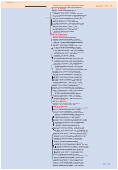 Phylogenetic analysis of PCV-3 complete genome sequences from this study, and the PCV-3 reference sequences from Franzo et al. [31]. The maximum likelihood tree was constructed with the Tamura–Nei model with Gamma plus I distribution (1000 replicates). The width of the branches is proportional to bootstrap values, and the scale bar indicates nucleotide substitutions per site. Sequences obtained in the present study are colored in red; sequences classified as PCV-3a are in the blue shadow, and the sequences of a tentative PCV-3b in orange shadow.
