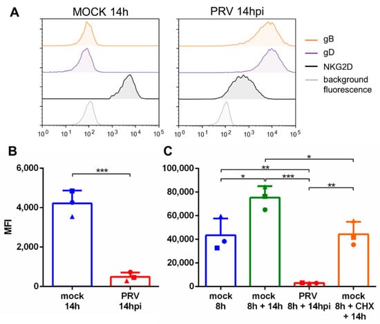 To confirm that the significantly lower NKG2D binding to SK cells cultivated for 8 h followed by PRV infection for 14 h compared to binding to SK cells cultivated for 8 h could not merely be explained by gradual turnover of NKG2D cell surface ligands from 8 h to 22 h of cultivation, an additional experimental condition was tested. Here, at 8 h of cultivation in suspension, SK cells were treated with cycloheximide (CHX, used at a concentration of 5 µg/mL as described before [35]) to prevent the production of new NKG2D ligands, allowing us to assess whether gradual turnover of NKG2D ligands may lead to reduced binding of NKG2D to cells 14 h later. As shown in Figure 1C, although cultivating SK cells for another 14 h in suspension in the presence of CHX prevented the increase in NKG2D binding observed in the absence of CHX, as expected, it did not significantly reduce NKG2D binding. Hence, we can conclude that PRV infection indeed not only prevents the de novo expression of NKG2D ligands on the cell surface, but also triggers downregulation of NKG2D ligands that are already present on the cell surface of infected cells. To investigate if (viral tegument proteins of) incoming PRV virions contribute to the downregulation of NKG2D ligands, UV-inactivated virus was used to inoculate SK cells and NKG2D binding was checked as mentioned before. We found that UV-inactivated virus was unable to trigger the downregulation of NKG2D ligands (Supplementary Figure S2).