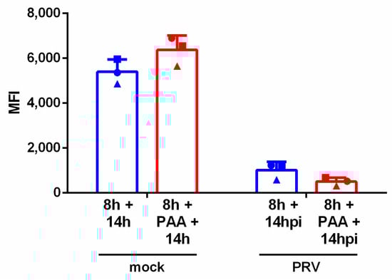 To investigate whether the expression of late viral genes is involved in the observed downregulation of NKG2D ligands, the DNA polymerase inhibitor phosphonoacetic acid (PAA) was used, as described before [36]. This inhibitor prevents the expression of late genes, since expression of these depends highly on viral genome replication. Like before, SK cells were cultivated in suspension for 8 h before PRV inoculation. PAA treatment (400 µg/mL) was initiated from 30 min before mock or PRV inoculation up to analysis at 14 hpi. Untreated cells served as a control. Successful PAA treatment was confirmed by Western blot, as assessed by expression of US3 (early protein) and lack of expression of gE (late protein) as described earlier [28,35,37] (data not shown). Figure 3 shows that addition of PAA did not affect PRV-induced downregulation of NKG2D ligand expression. Hence, expression of late genes is not required for downregulation of NKG2D ligands in PRV-infected SK cells.