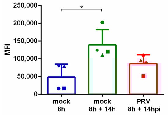 pULBP1 expression on the cell surface is reduced after PRV infection. SK cells were cultivated in suspension for 8 h before mock or PRV inoculation. At the indicated time points, pULBP1 expression on the cell surface was measured using flow cytometry. Graphs show the median fluorescence intensity (MFI) for each condition. Bars represent the mean value ± SD; different symbols correspond to individual data points from different independent repeats, n = 4. Statistically significant differences are indicated with asterisks (* p < 0.05).