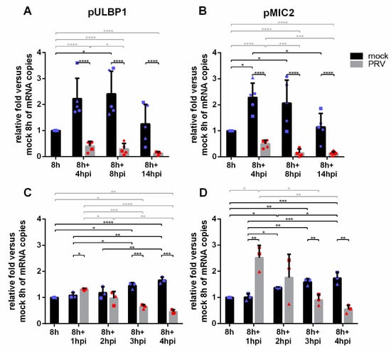 mRNA expression of pULBP1 and pMIC2 in SK cells upon mock or PRV infection. Gene expression of (A) pULBP1 and (B) pMIC2 were analyzed in mock-infected SK cells or PRV-Kaplan-infected SK cells at different time points as shown in the graph, and were normalized to gene expression in SK cells cultivated in suspension for 8 h. Graphs represent the mean and SD values of relative mRNA expression obtained from five (A,B) or three (C,D) independent repeats of the experiment, n = 5 or n = 3. Statistically significant differences are indicated with asterisks (* p < 0.05, ** p < 0.01, *** p < 0.001, **** p < 0.0001).