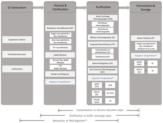 Bioprocess options in the production of lentiviral vectors. Some studies have shown sequence of membrane filtration of different pore sizes or inclusion of low-speed centrifugation prior [,,]. Sequence of filtration processes would be an option depending on scale and cell density and product and impurity profile. These are examples of sequences of operations used in pre-clinical and clinical investigations [,,]. Benzonase may be added at a variety of steps within the downstream process.