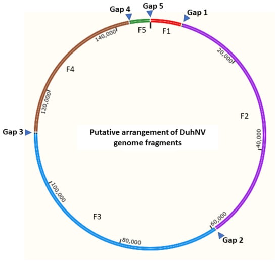 Putative arrangement of fragments F1–F2–F3–F4–F5 in the 147,179 bp assembled DuhNV genome sequence. Triangles represent sequence gaps. The putative genome schematic was generated by SnapGene Viewer v5.2.1.