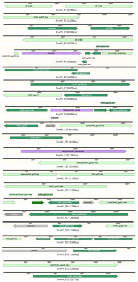 Map of the 22 DvvNV genomic fragments. Arrows indicate ORFs and ORF orientation. Green, ORFs that hit nudiviruses; purple, core genes; grey, unknown ORFs; light green, partial ORFs.