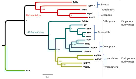 Phylogenetic tree based on nudivirus core sequences. Protein sequences encoded by 31 core genes were downloaded from the NCBI database for 13 sequenced nudiviruses, four endogenous nudiviruses and a baculovirus, Autographa californica nucleopolyhedrovirus (ACN, outgroup; Supplementary Table S3). Abbreviations for exogenous nudiviruses from Table 1. AgENV, Aphis glycines endogenous nudivirus; MsENV, Melanaphis sacchari endogenous nudivirus; NlENV, Nilaparvata lugens endogenous nudivirus; VcENV, Venturia canescens endogenous nudivirus. Core sequences of AgENV and MsENV were previously reported []. The phylogenetic tree was built using supermatrix methods with ETE Toolkit v3. The tree was edited and viewed using FigTree. Taxonomic categorization of host species for most nudiviruses is indicated. * HzNV represents both HzNV1 and HzNV2. Numerals at branch points indicate bootstrap support.