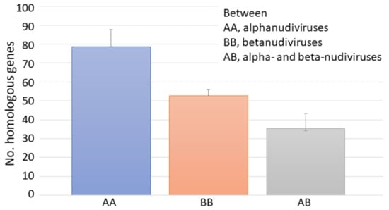 Numbers of homologous proteins among nudiviruses as determined by BLASTp. The cutoff E-value for determination of homology was set at 0.0001. Bars represent SD of the mean.